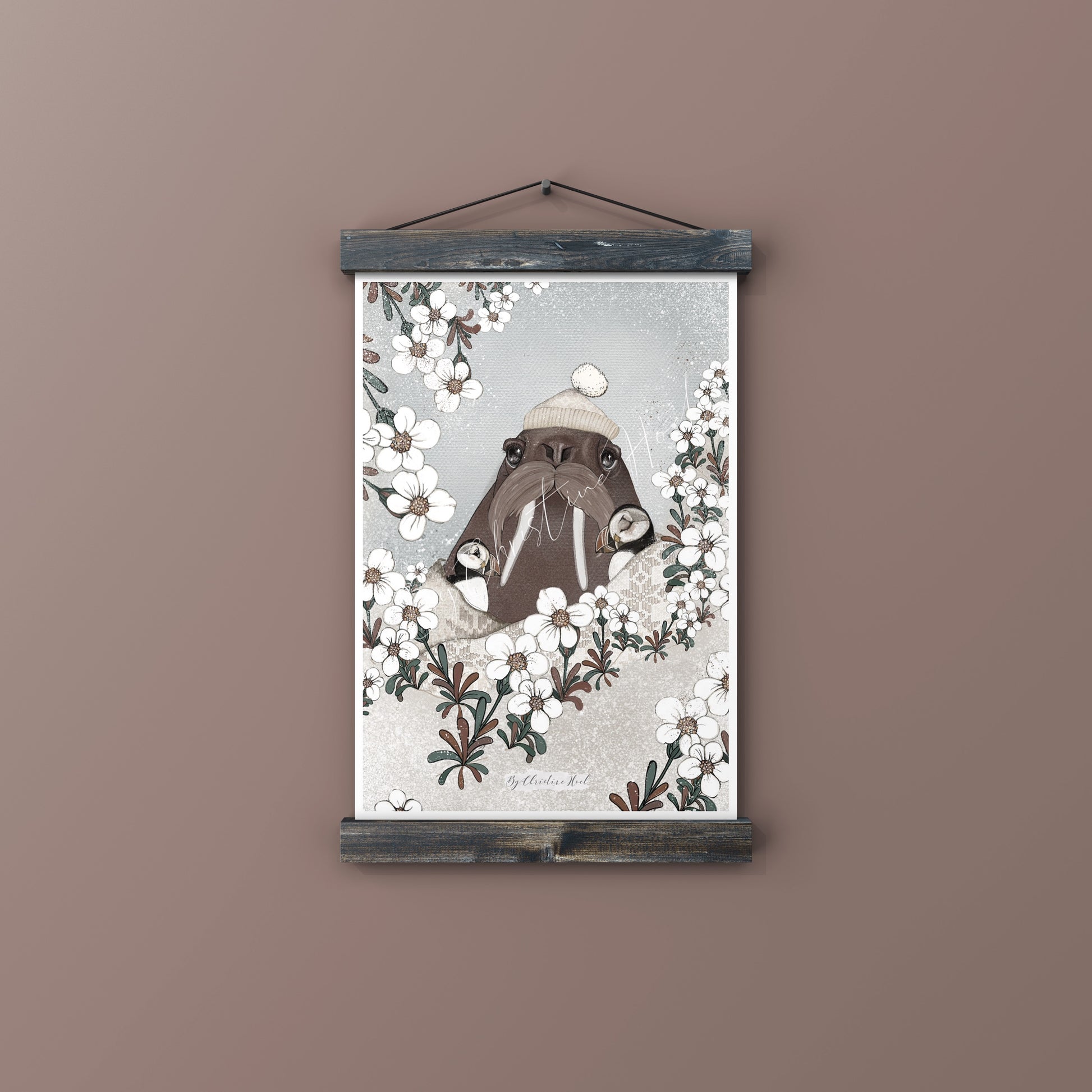 💫 🥰 Hvalrossen og lundefuglene omgitt av blomster; arktisk fjellpryd.